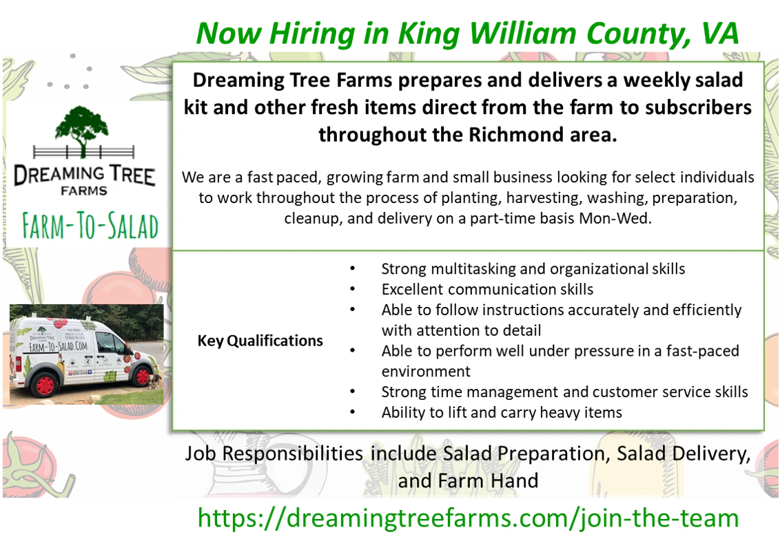 Dreaming Tree Farms is based in Aylett, VA and prepares a weekly salad kit and delivers salads and other fresh items direct from our farm to the customer doorstep throughout the metro Richmond area. We are a fast paced, growing company looking for select individuals to work throughout the process of harvesting, washing, prep, cleanup, and delivery on a part-time basis Mon-Wed.