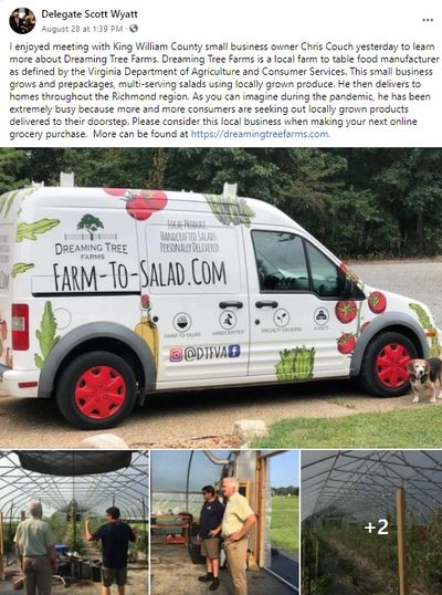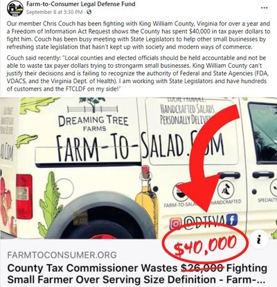 Couch said recently: "Local counties and elected officials should be held accountable and not be able to waste tax payer dollars trying to strongarm small businesses. King William County can’t justify their decisions and is failing to recognize the authority of Federal and State Agencies (FDA, VDACS, and the Virginia Dept. of Health). I am working with State Legislators and have hundreds of customers and the FTCLDF on my side!”